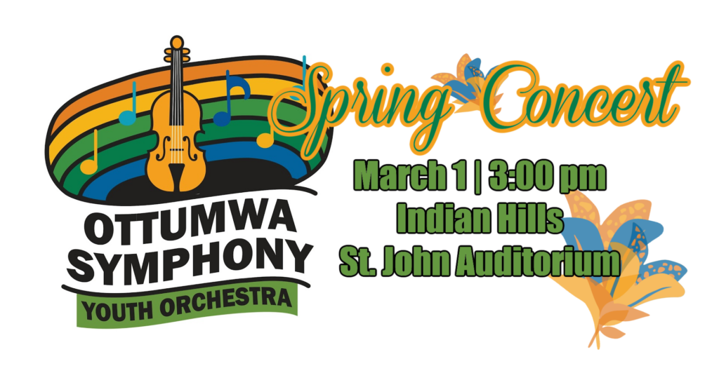 The Ottumwa Symphony Youth Orchestra will present its Spring Concert on Sunday, March 1 at 3:00 PM in the St. John Auditorium at Indian Hills Community College. This performance marks the final concert of the Youth Orchestra’s season and promises an exciting afternoon of music for the community.